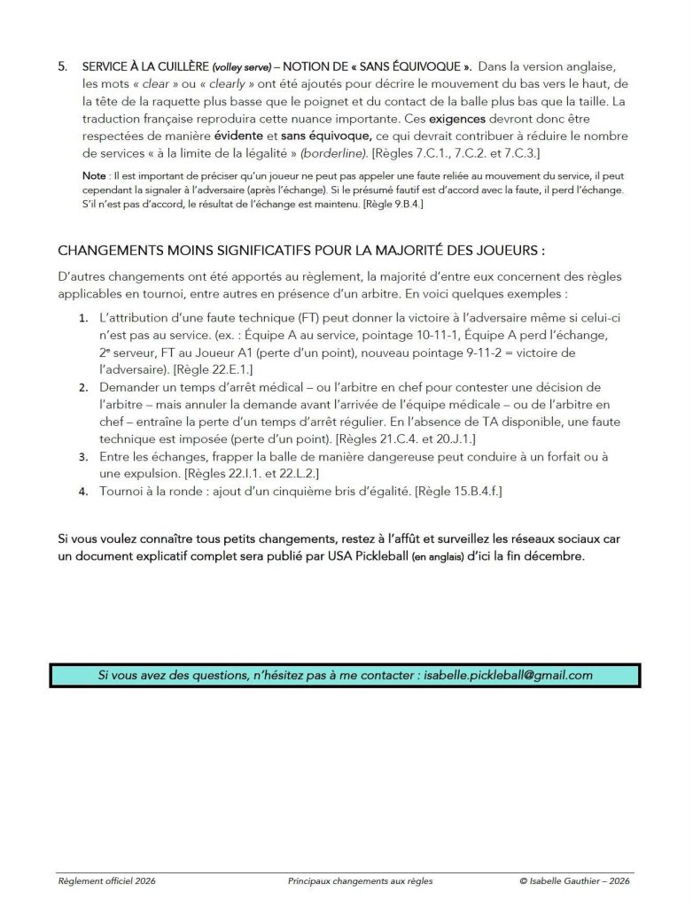 Plus bas vous trouverez le résumé des principaux changements réalisé par d’Isabelle Gauthier, arbitre certifié Pickleball Canada et USA Pickleball.